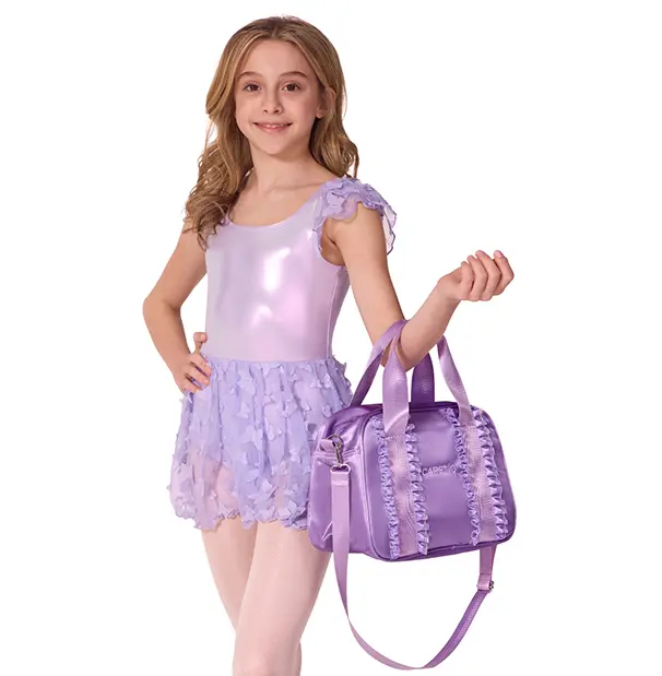 Az Eloise Ruffle Dance Bag tánctáska tökéletes választás azoknak a kislányoknak, akik szeretik a táncot, a stílust és a csillogó részleteket. Az elülső fodor nőies, elegáns megjelenést kölcsönöz a táskának, a cipzáron lévő balerina alakú ezüst dísz pedig igazi kincsé teszi minden kis táncos számára.