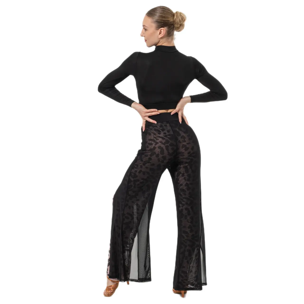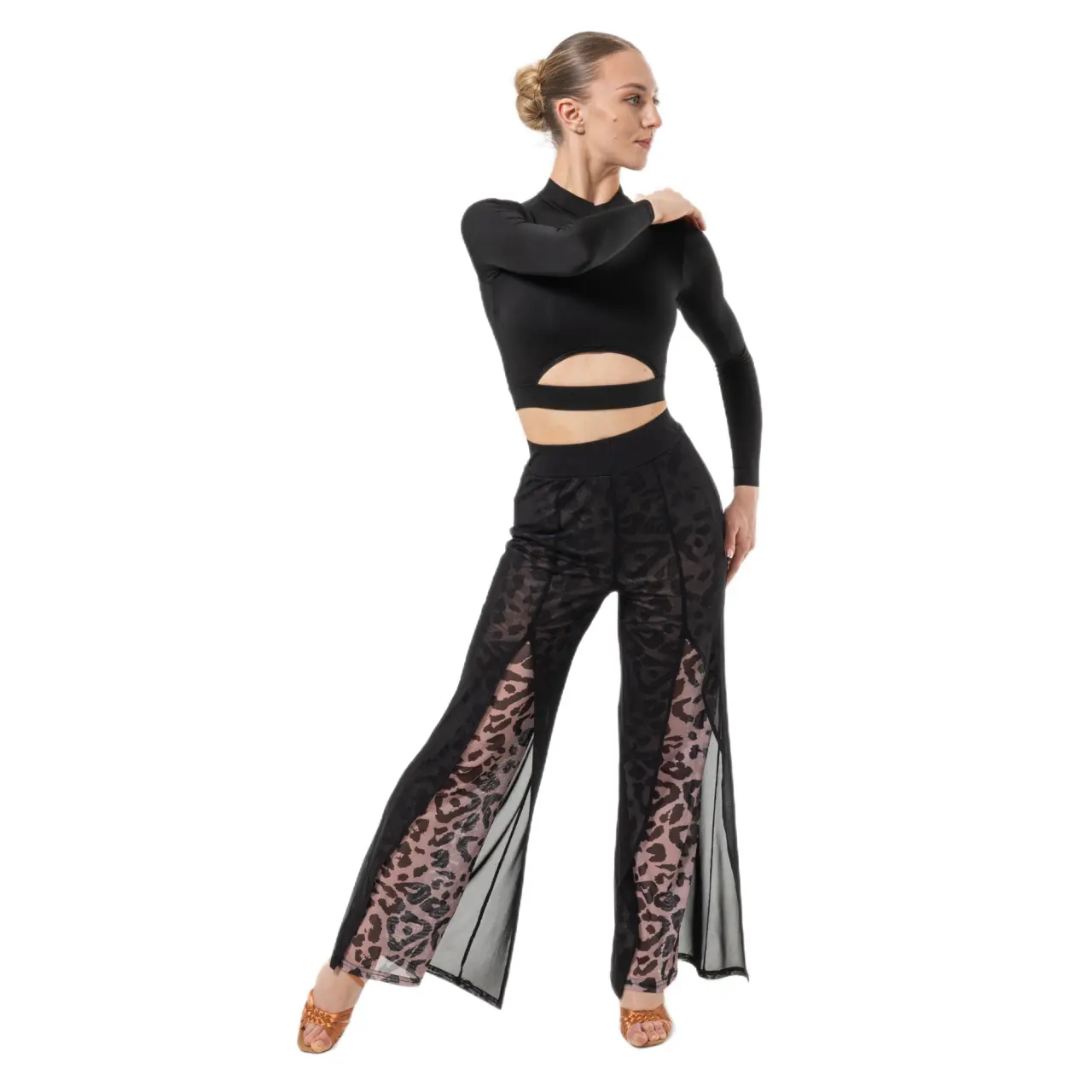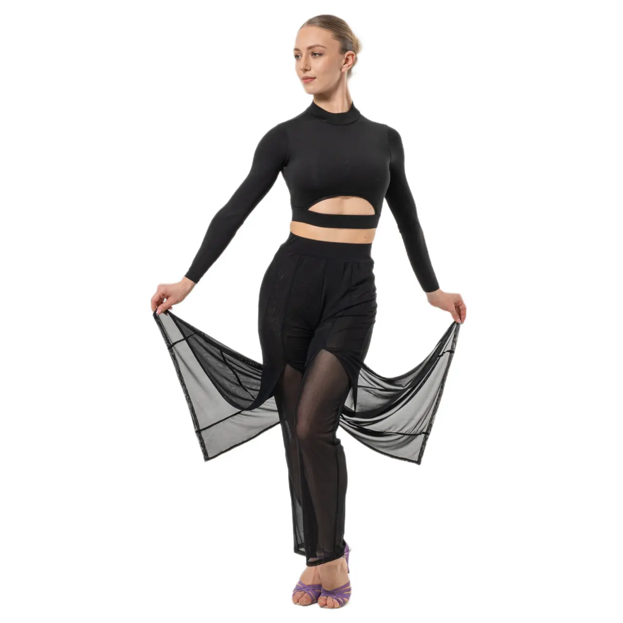 Az áttetsző panelek érzékiséget és vizuális könnyedséget adnak a modellnek, míg a derék és a csípő környékén testhez simuló szabás szépen formálja az alakot a mozgás korlátozása nélkül. A lapos gumis derékrész kényelmes viseletet és megbízható tartást biztosít a tánc egész ideje alatt.