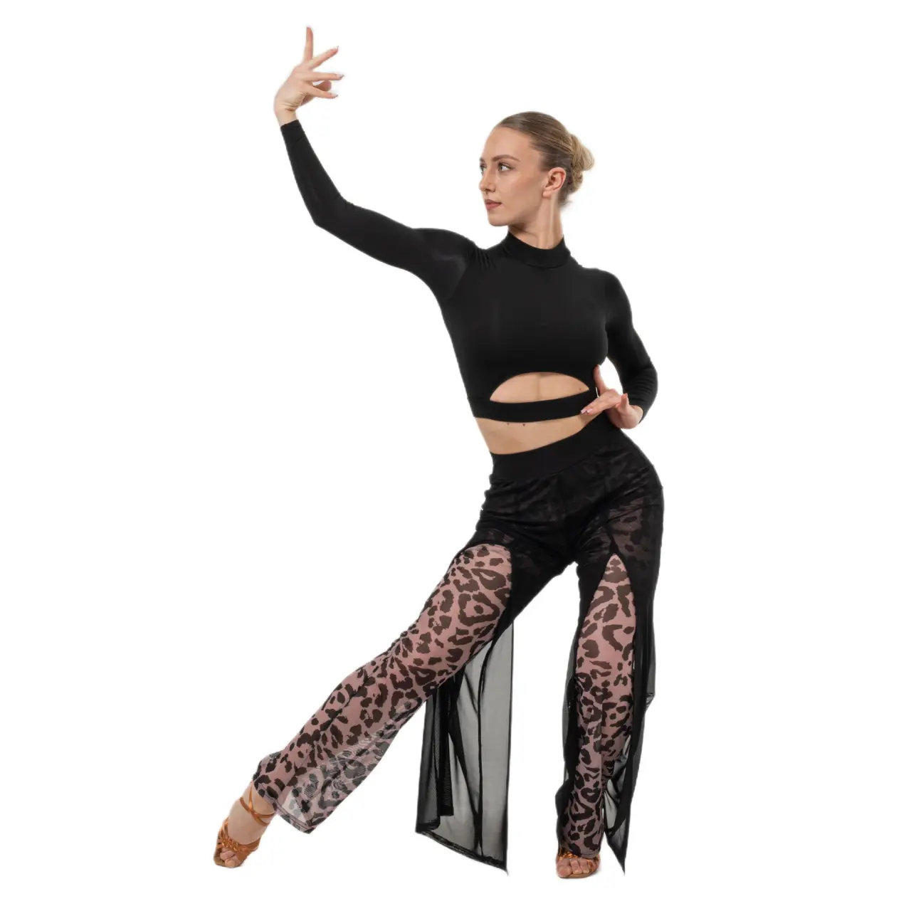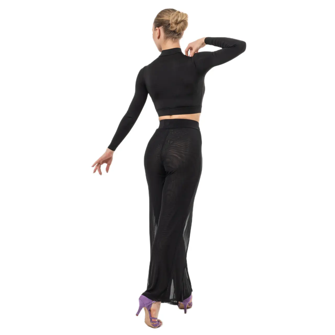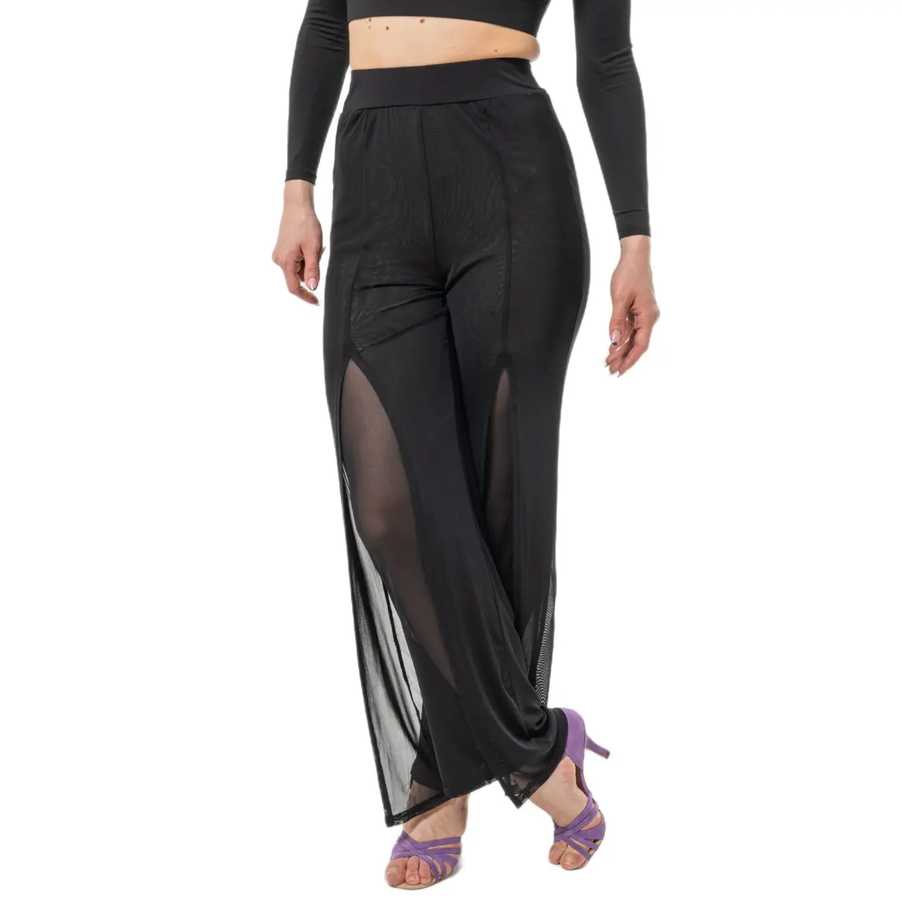 Az áttetsző panelek érzékiséget és vizuális könnyedséget adnak a modellnek, míg a derék és a csípő környékén testhez simuló szabás szépen formálja az alakot a mozgás korlátozása nélkül. A lapos gumis derékrész kényelmes viseletet és megbízható tartást biztosít a tánc egész ideje alatt.
