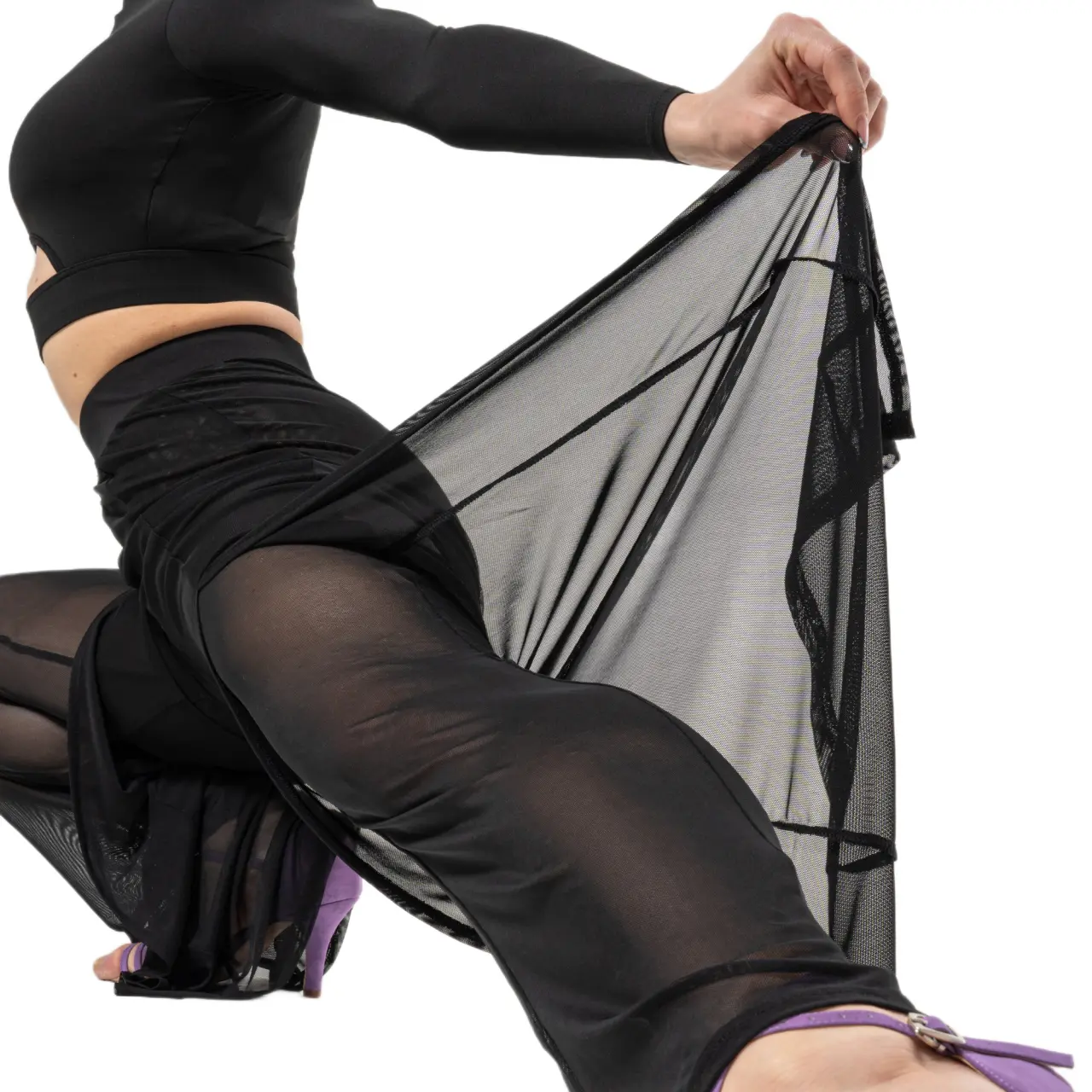 A nadrág finom hálós anyagból készült, amely könnyű, légáteresztő, és mozgás közben gyönyörűen omlik. Az anyag dupla rétegei a hosszú hasítékokkal kombinálva látványos, dinamikus megjelenést teremtenek – minden lépésnél elegánsan megnyílik az anyag, és kiemeli a lábak vonalát.